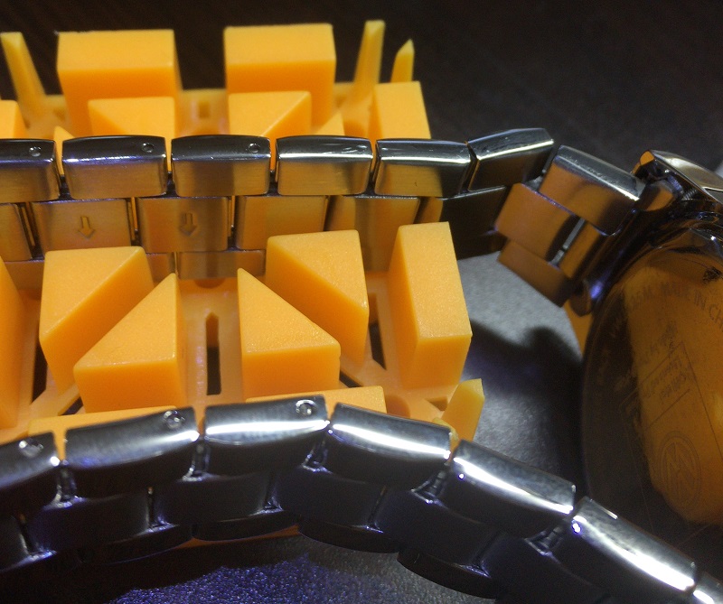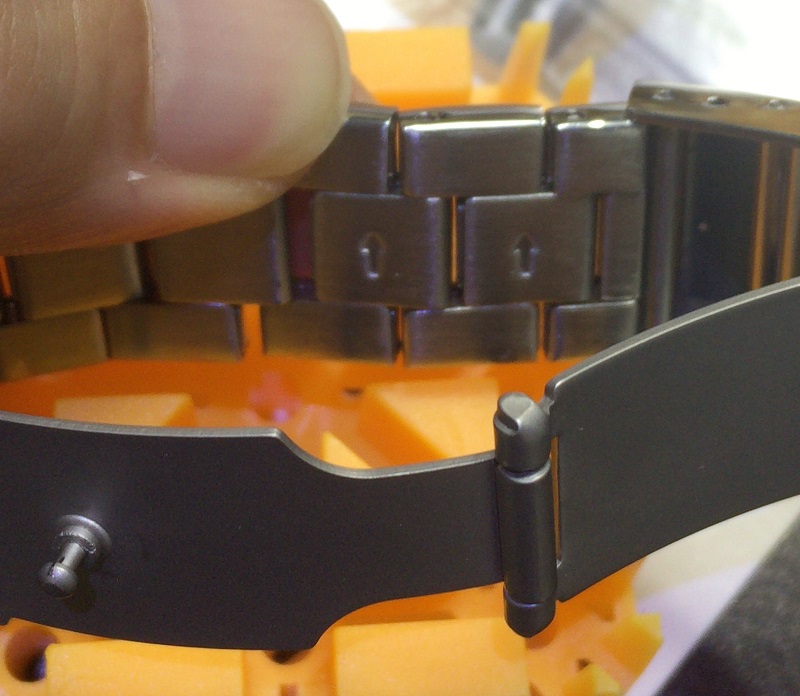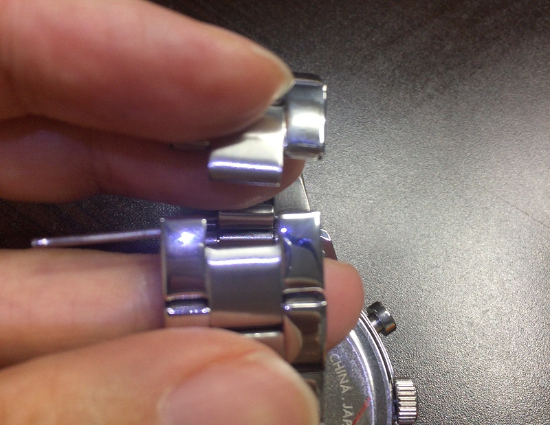 그러면 위 사진과 같이 분리가 됩니다 시계줄 유닛과 시계줄 심을 분리 할 때, 심의 방향 등을 잘 기억해 두시기 바랍니다 (다시 고정시킬 때 반대로 심을 넣어야 하기 때문입니다) 그리고 이쯤 단계에서 본인에 팔목 두께 그리고 시계의 메인 부분과 본인의 팔목 두께 등을 서로 확인해가며 시계줄 유닛을 분리하시기 바랍니다