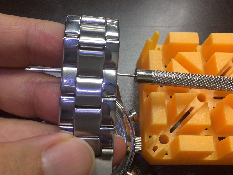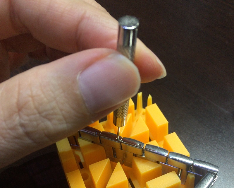 그리고 미니핀도구를 시계줄 핀을 구멍에 고정시킨 뒤 미니 망치를 사용하여 미니핀 도구를 두드립니다