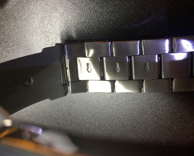 시계줄에 심이 들어가 있는데 제 시계의 경우 안쪽에 위 사진과 같이 화살표가 있습니다 즉, 화살표 방향으로 시계줄 핀을 밀어내면 핀이 분리가 되게 됩니다. 이 화살표를 확인해 둔 뒤,